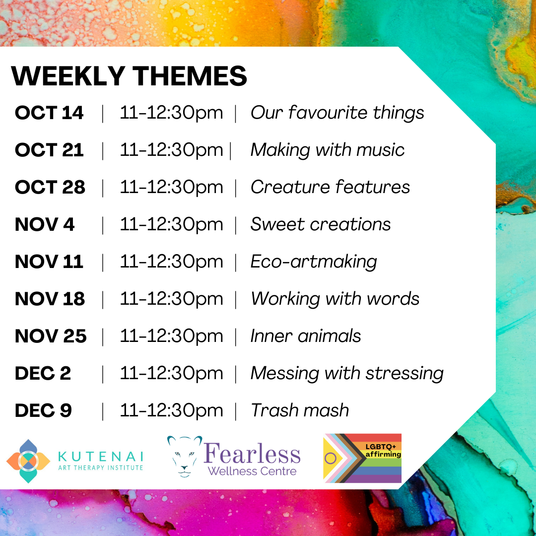 Weekly sessions will be led by art therapy intern Britney Hope. Workshops run from Oct 14th to December 9th. Registration is weekly, and you can join as many workshops as you like. Each session is $35 including HST